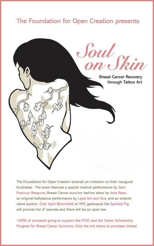 This past weekend the Foundation for Open Creation (FFOC) – a non-profit organization whose self-described mission is to “integrate self-expression into the medical community and the community-at-large,” – held a Soul on Skin fundraiser to raise money not only for themselves and their program, but also for a Tattoo Scholarship Program for Breast Cancer survivors. The FFOC and the scholarship program aim to “develop the idea that art, specifically tattoo art, can augment the recovery process for those with issues both physical and psychological.”