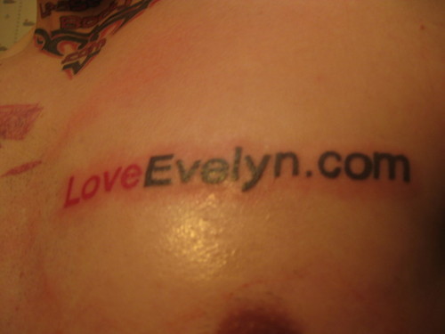 Enough about what I learned from tattoo advertising. I just had another tattoo advertisement done on Tuesday. This tattoo advertisement was for the website LoveEvelyn.com. I was supposed to get this tattoo advertisement a few weeks ago but my artist was booked up. LoveEvelyn.com is an awesome website if you are into porn. For those of you who have not heard of Evelyn Lin she is one of the hottest Asian porn stars out there. If you are into porn I definitely recommend this website.